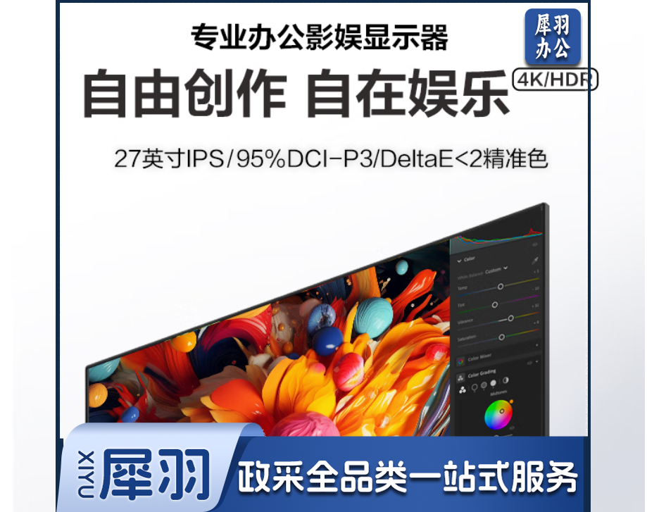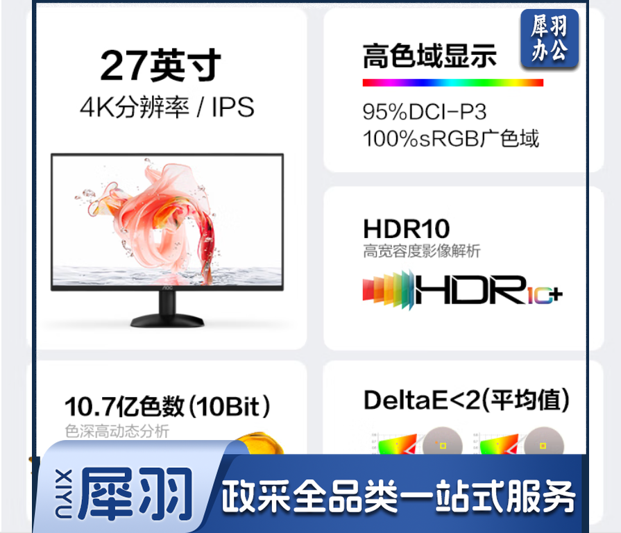 AOC 27英寸 4K IPS广色域 HDR 出厂校色 低蓝光不闪 节能认证 三边微边 超薄办公电脑显示器 U27B35