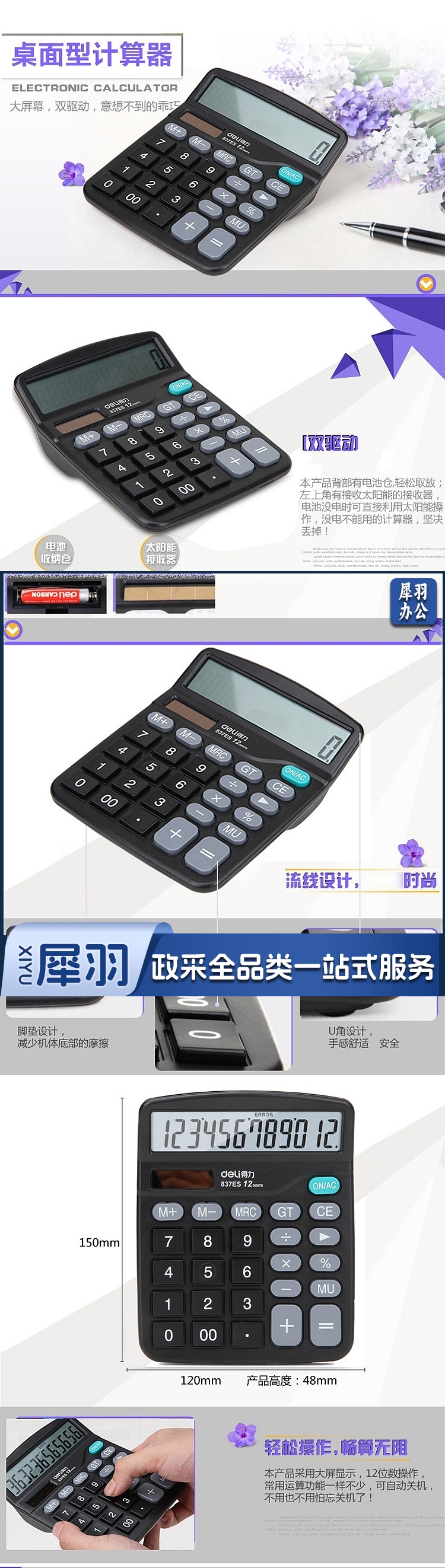 得力 计算器 837ES双电源桌12位大屏幕计算机