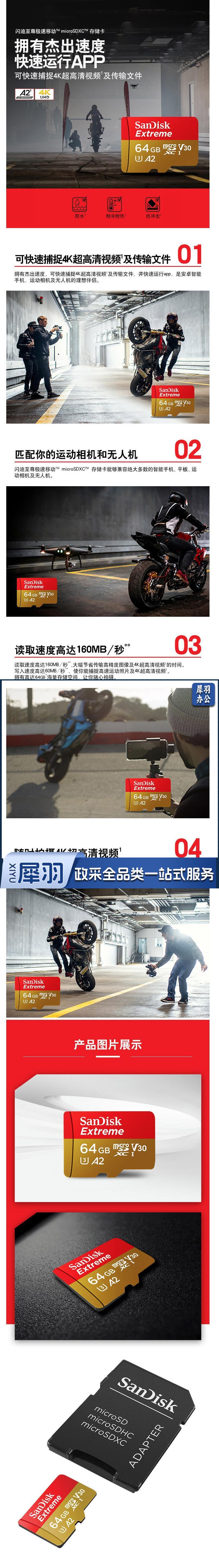 闪迪(SanDisk)64GB TF(MicroSD)存储卡 U3 C10 A2 V30 4K 至尊极速移动版内存卡 读速160MB/s 写速60MB/s
