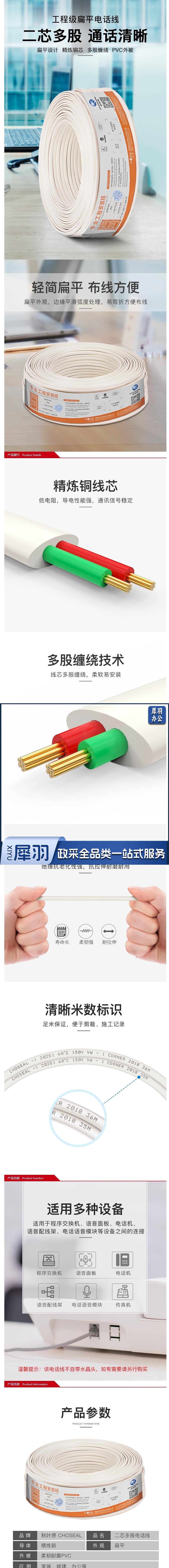 秋叶原(CHOSEAL)QS80T100S 2芯多股电话线 纯铜线芯 扁平线身线100米