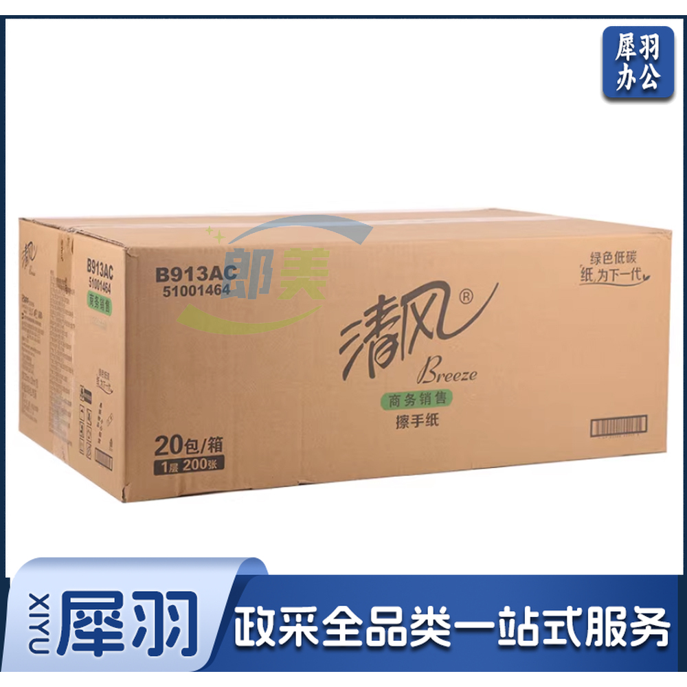 清风B913AC单层三折擦手纸 (225mm×230mm/抽)×200抽/包×20包/箱