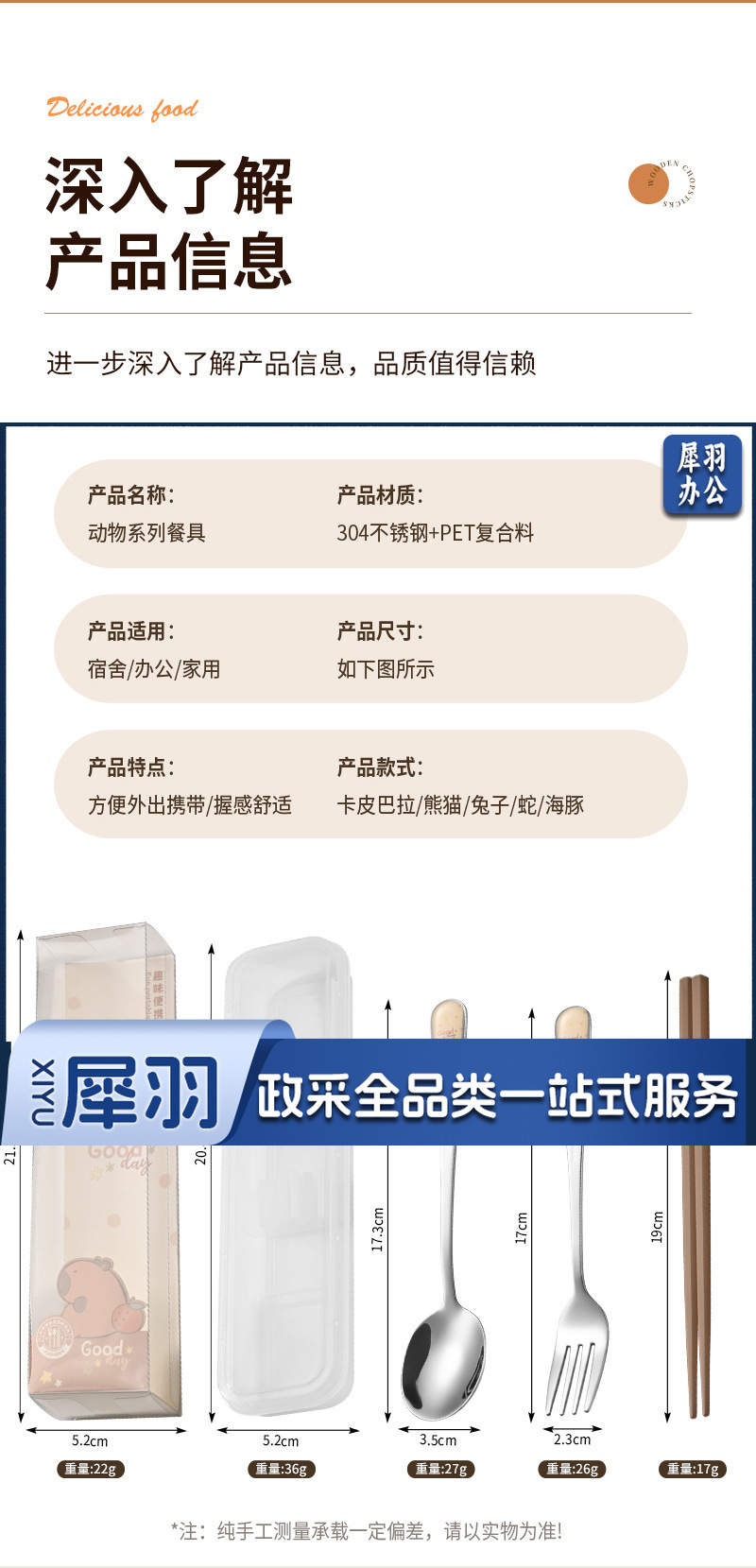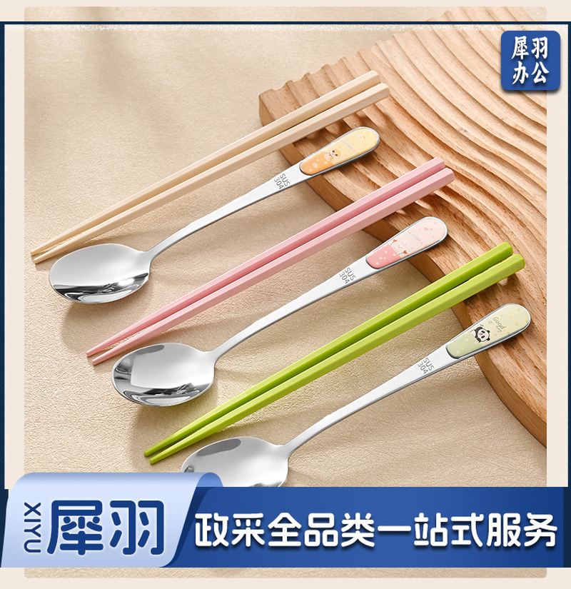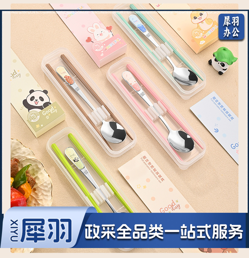 304不锈钢便携式餐具儿童学生勺子叉子筷子勺筷套装卡通( 熊猫绿(勺叉筷))