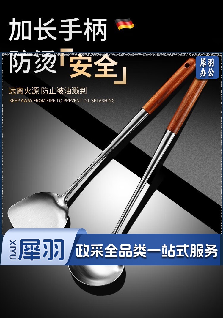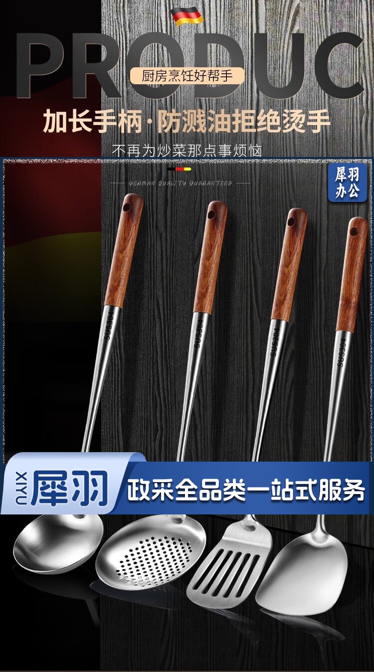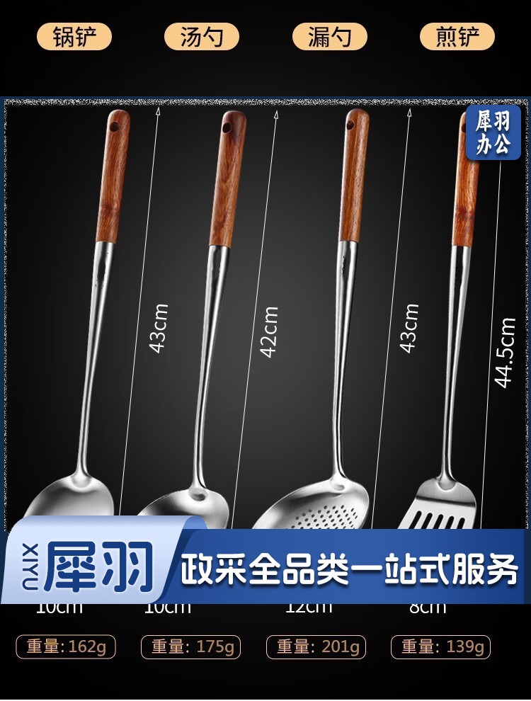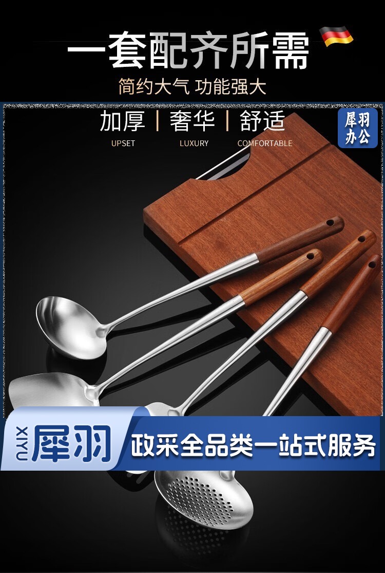 加厚加长不锈钢炒菜铲子木柄锅铲煎铲汤勺漏勺家用厨具套装锅铲 花梨木加长(厨具四件套) 全套勺铲