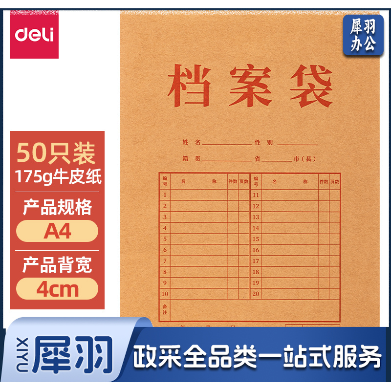 得力(deli) 5952-50纯浆牛皮纸档案袋(175g-4cm)(黄)(50个/包)