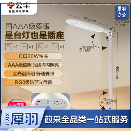 公牛(BULL)ML-E012D-CS 20W快充插座台灯 国AAA级护眼 防蓝光护视力台灯 卧室宿舍学生儿童学习台灯 无极调光+2位总控