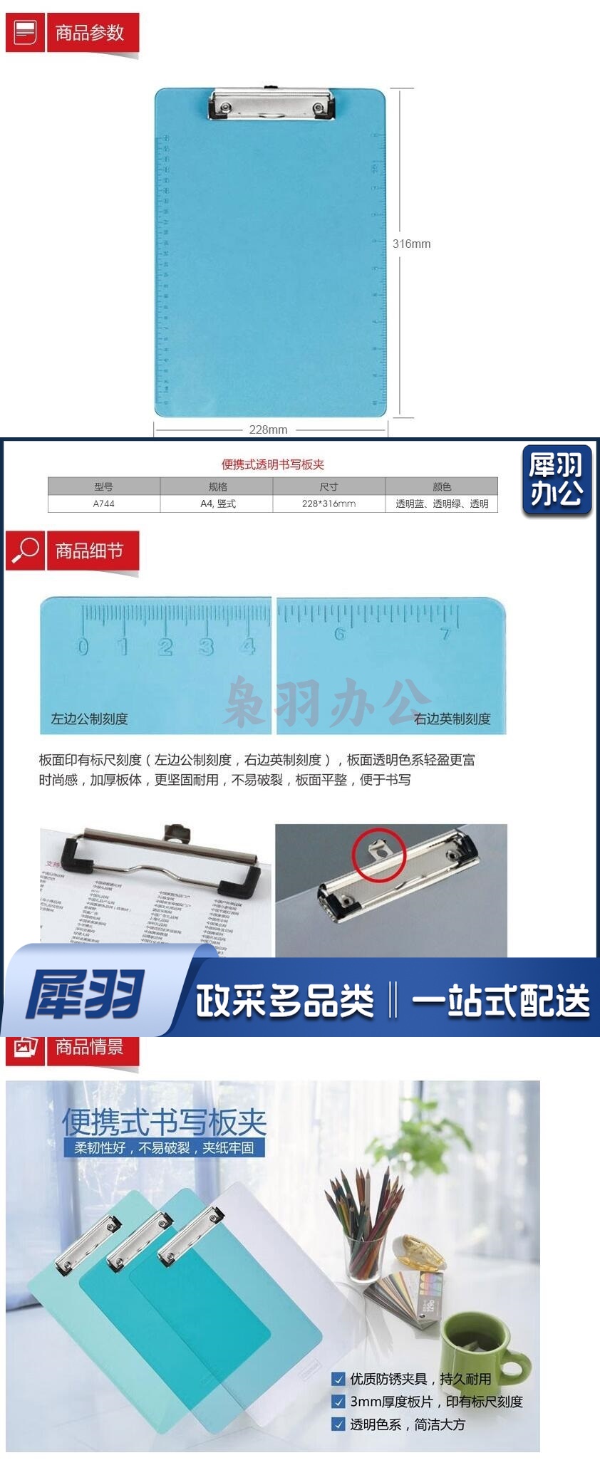 齐心书写板夹 A744 塑料板夹 货号:WY