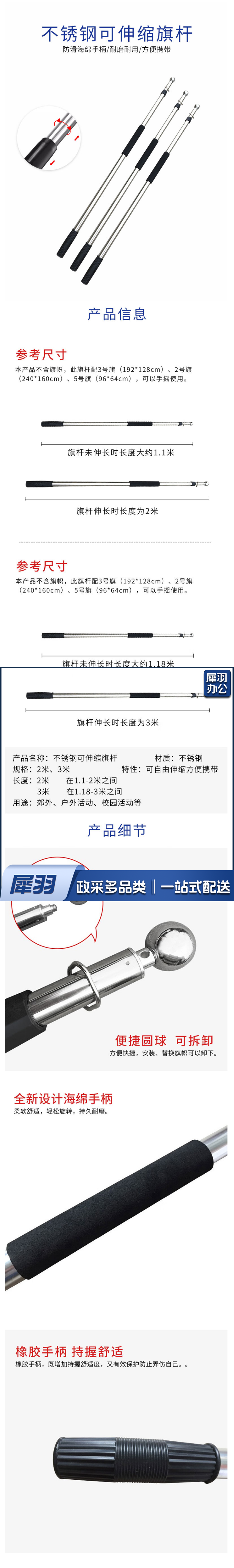 手持党旗旗杆 加粗加厚 国旗伸缩旗杆红旗杆收缩党旗杆国旗杆户外 3米不锈钢伸缩旗杆