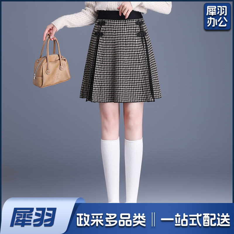 国风复古毛线千鸟格半身裙时尚气质女装短款高腰A字裙针织毛线裙 卡色