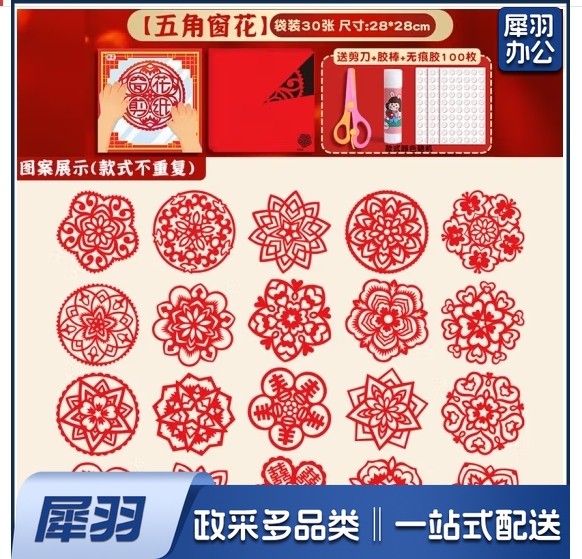 四季年华儿童新年剪纸手工折纸彩纸剪窗花专用纸幼儿园手工工具套装diy制作中国风剪纸剪刀材料包底稿图 五角窗花/30张