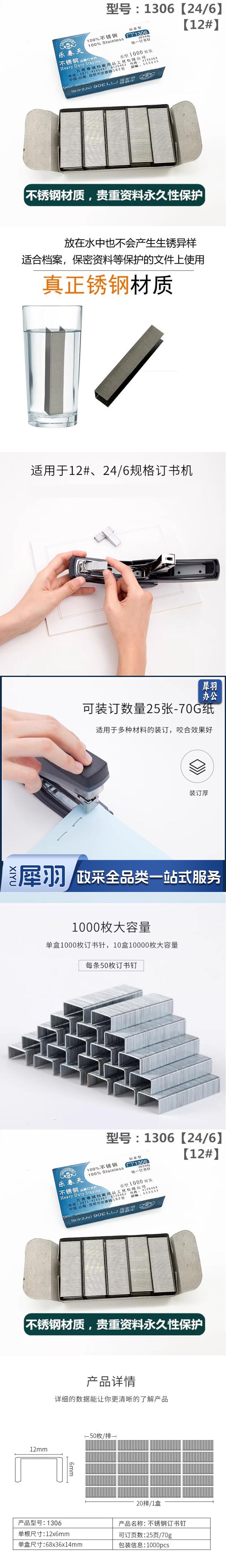 乐春天1306 不锈钢 24/6 订书钉 1306 标准12# 档案局统一订书针不生锈