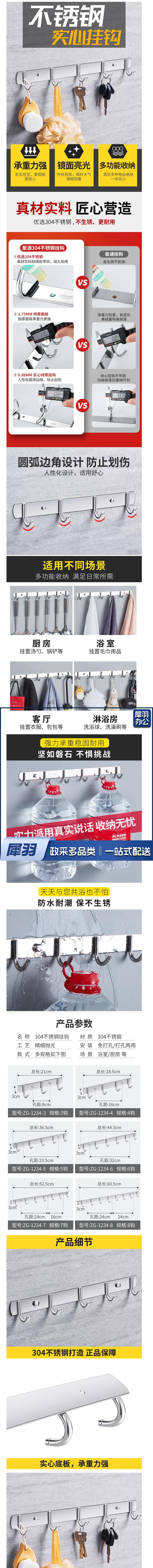 不锈钢衣钩 免打孔排钩 亮光加厚6钩 304不锈钢 货号:NK