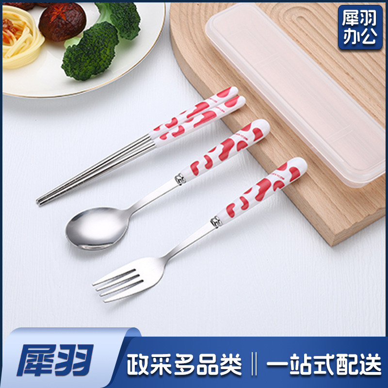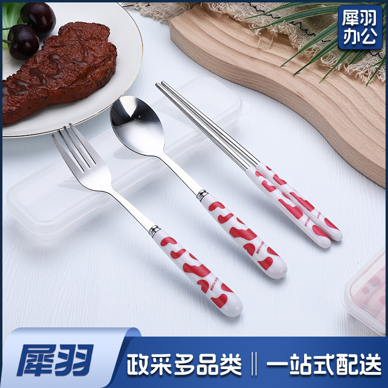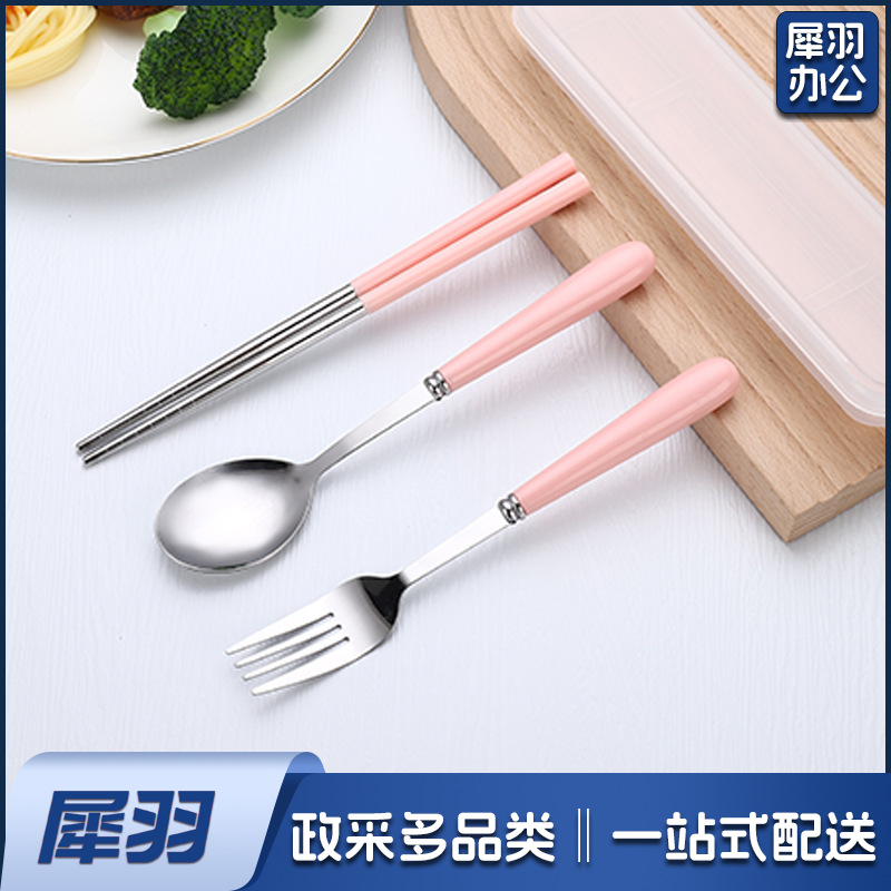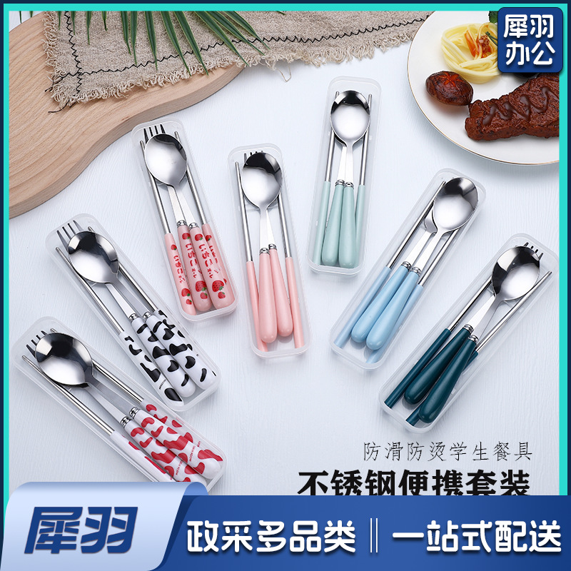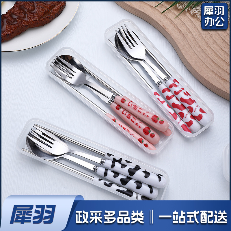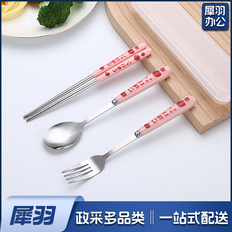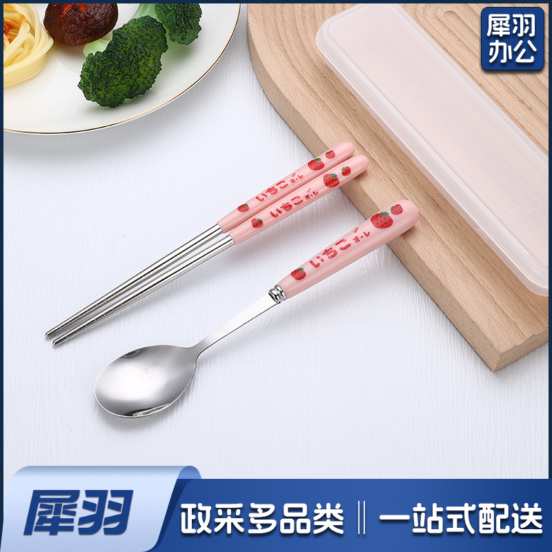 不锈钢便携餐具三件套学生户外仿陶瓷儿童手柄叉子筷子勺子套装(草莓粉两件套(带盒))