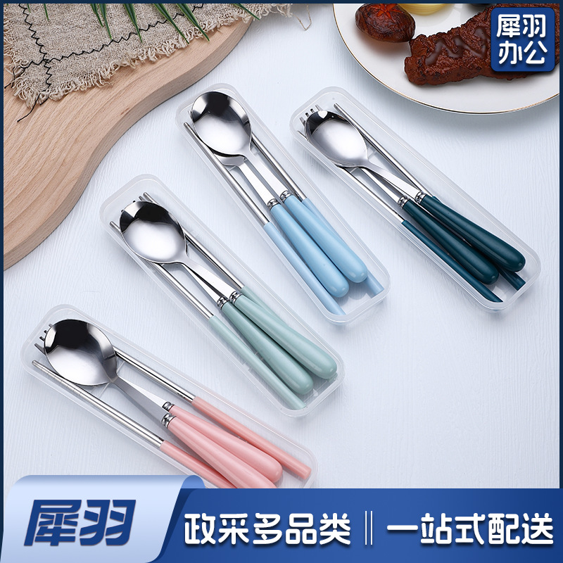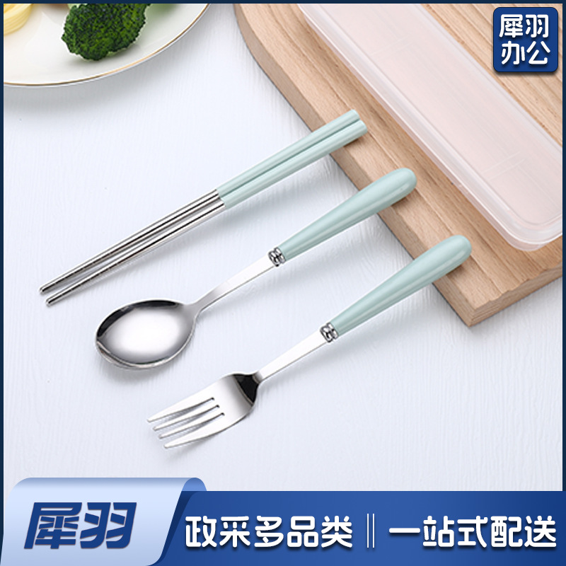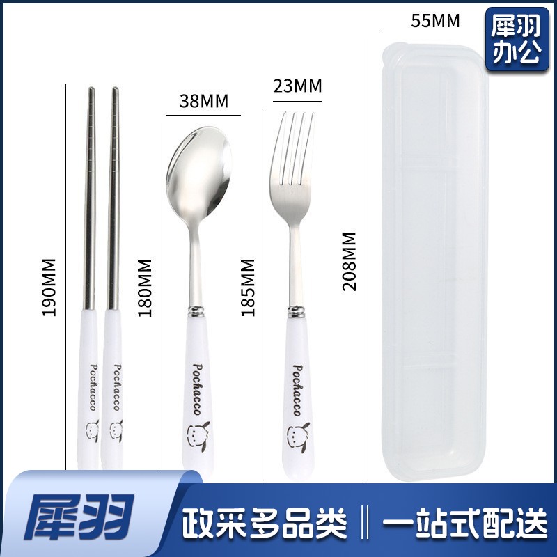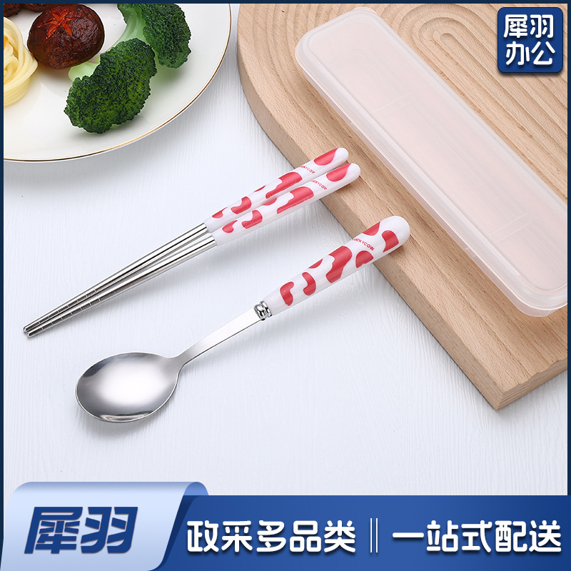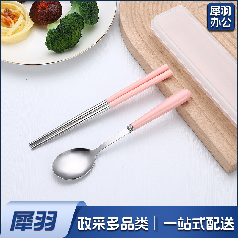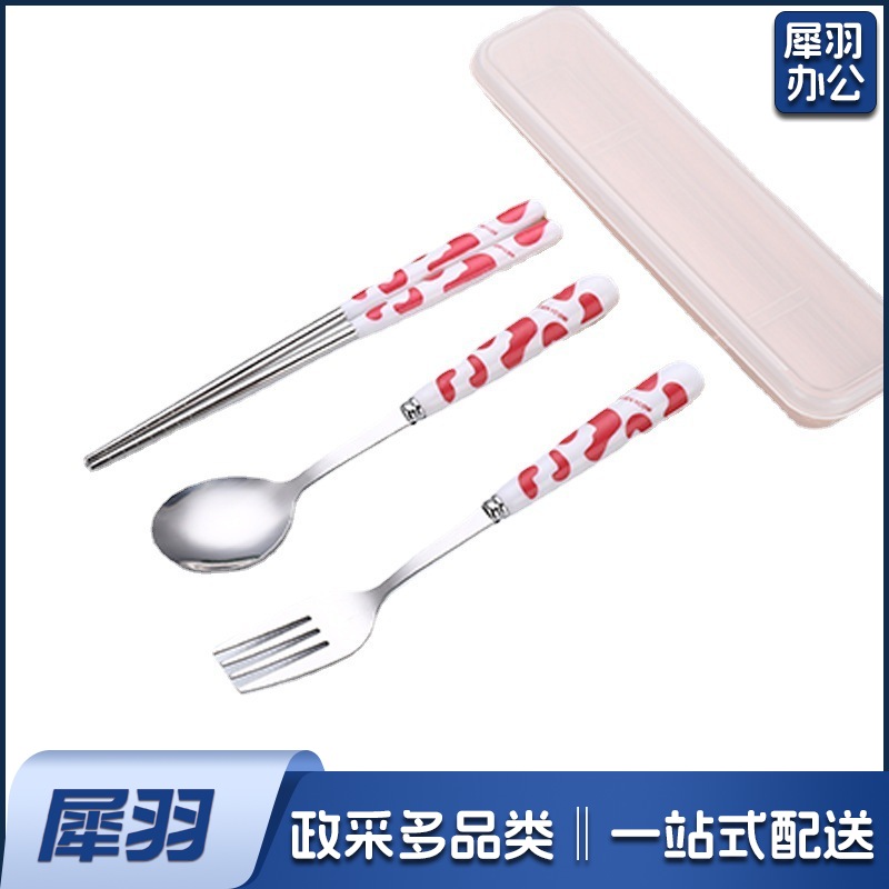 不锈钢便携餐具三件套学生户外仿陶瓷儿童手柄叉子筷子勺子套装(草莓粉两件套(带盒))