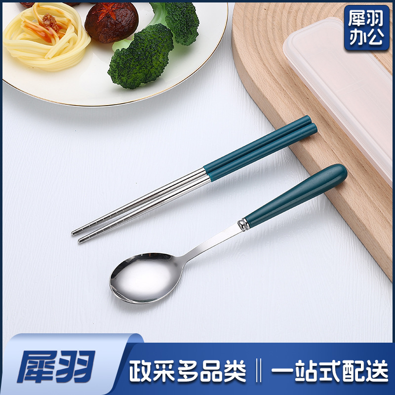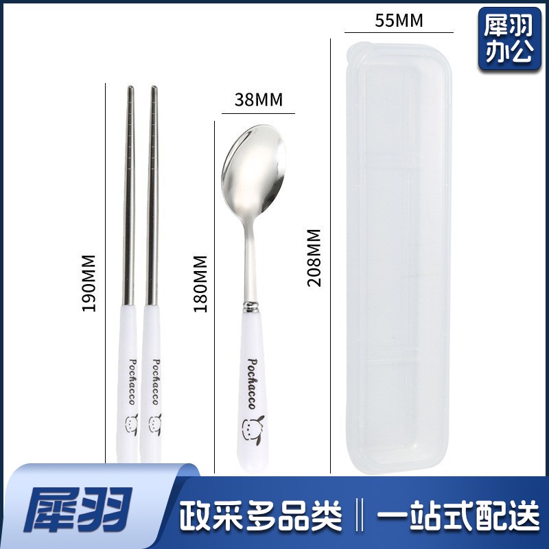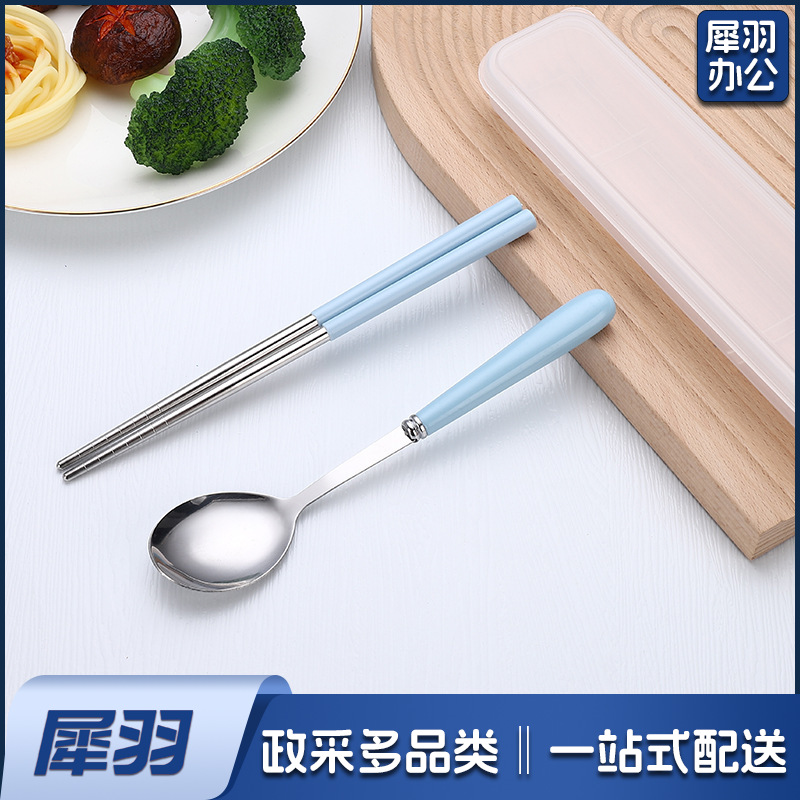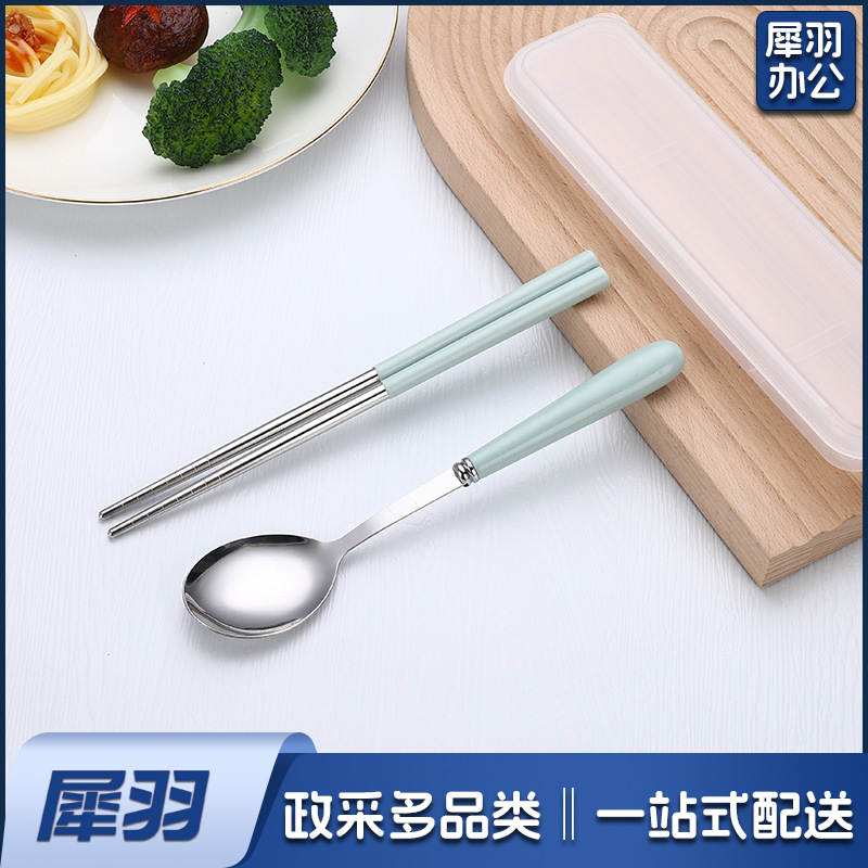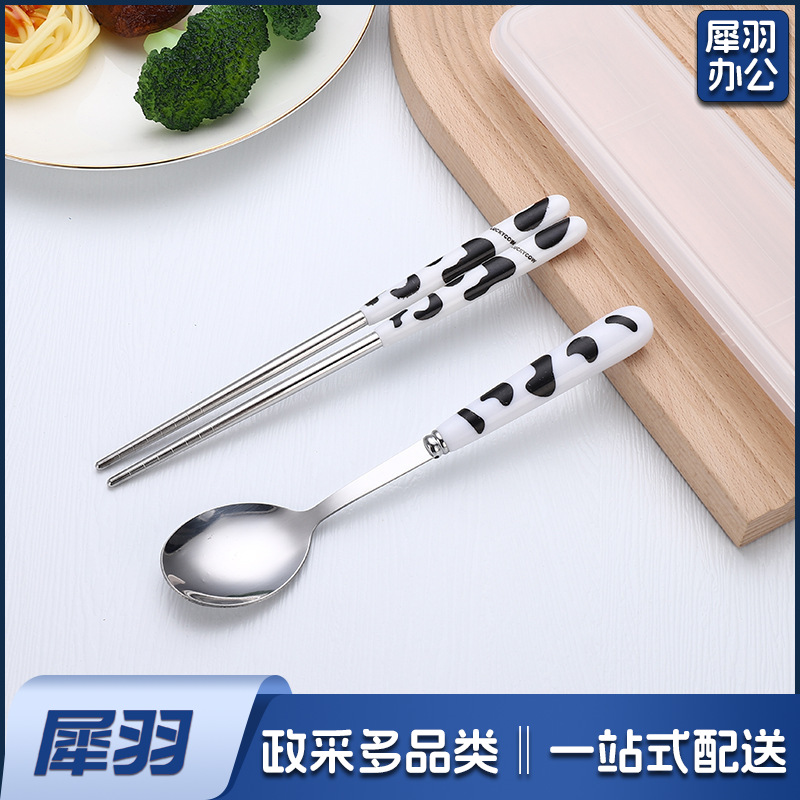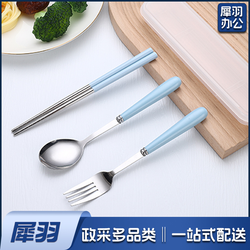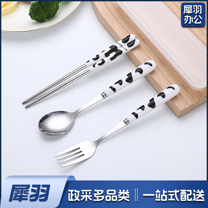 不锈钢便携餐具三件套学生户外仿陶瓷儿童手柄叉子筷子勺子套装(草莓粉两件套(带盒))