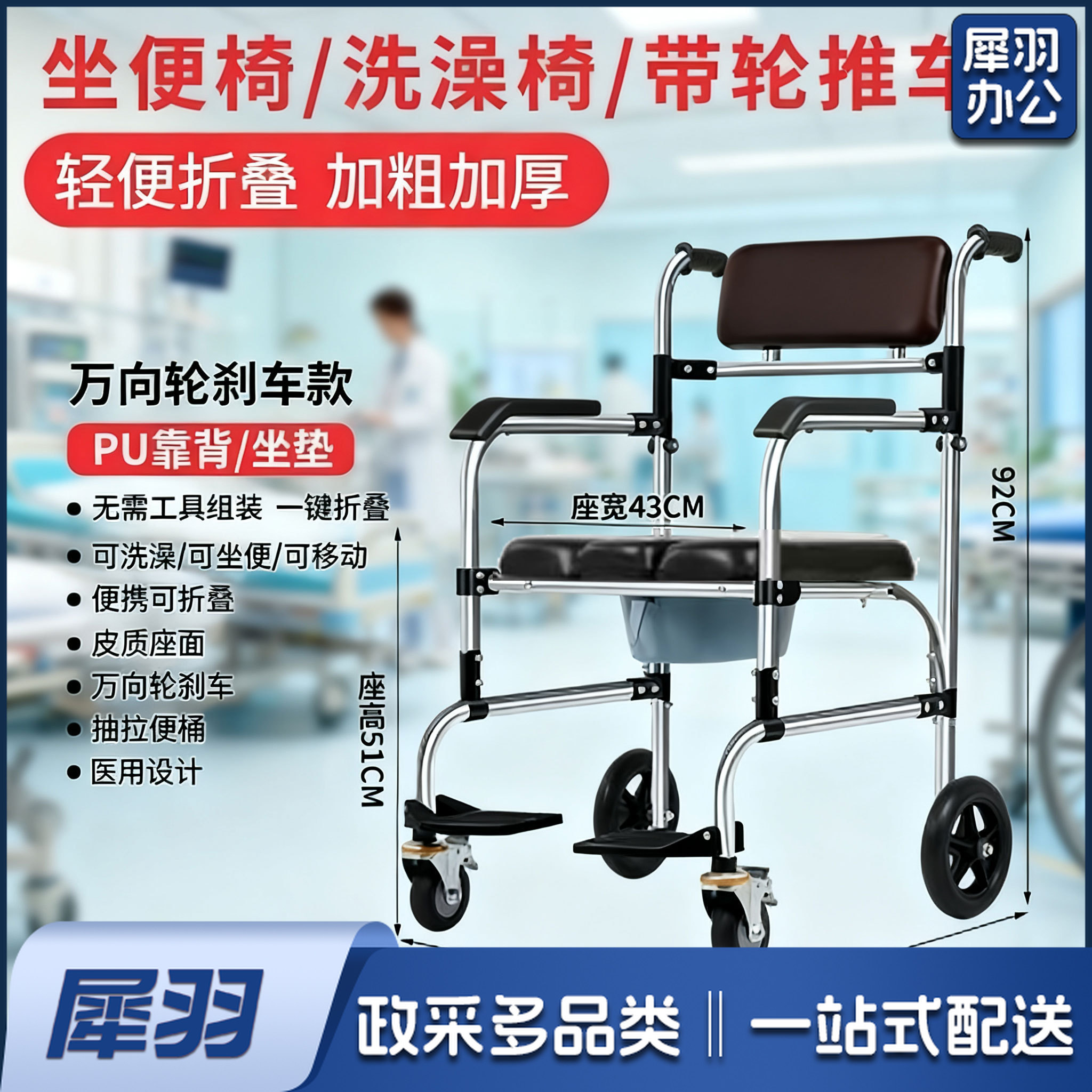 护理版软座可折叠移动洗澡椅/尺寸:60*50*92cm 座宽43cm 座高51cm 加厚不锈钢材质万向轮可刹车,PU靠背坐垫 一键折叠 抽拉便桶 坐厕+洗澡