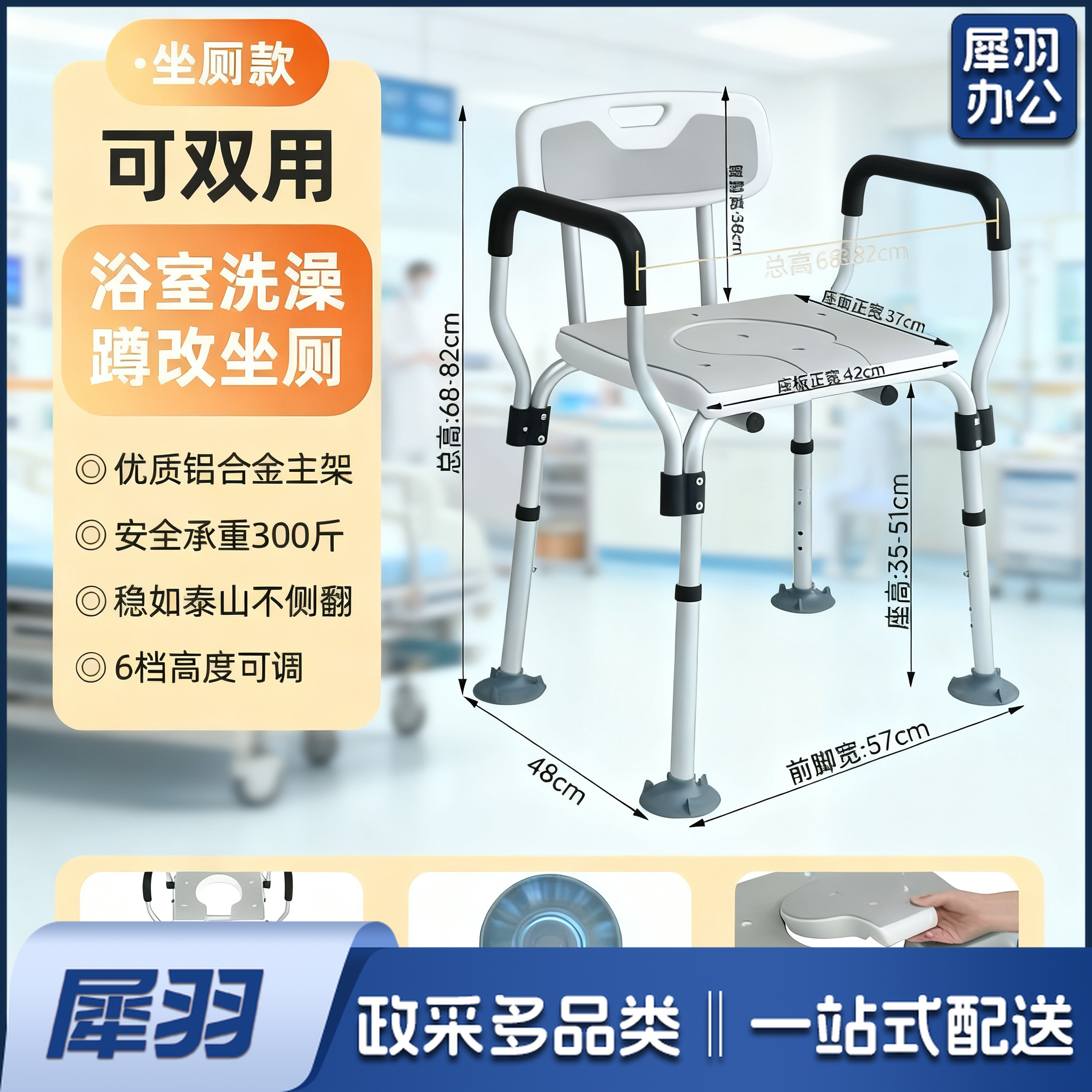 洗澡专用防滑淋浴折叠洗澡 凳/尺寸:48*57*82cm 座宽42cm 座高最高51cm 扶手间距:64cm 航空级铝合金 吸盘脚垫 可洗EVA软垫 一体式靠背 承重;300KG 高度调节6档 自带花洒扣 坐厕+洗澡
