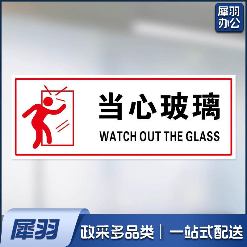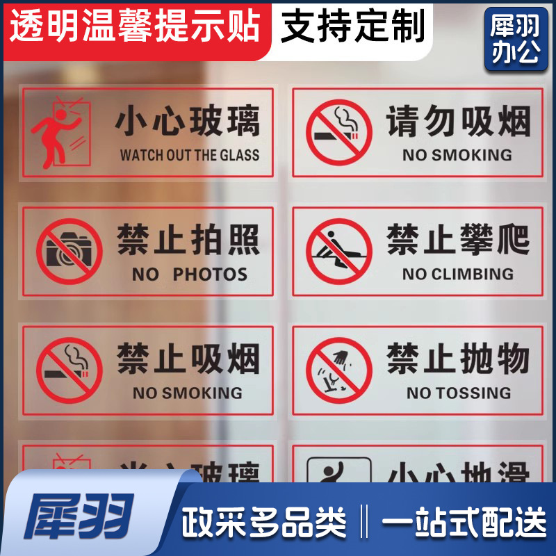 当心玻璃【25x10cm】小心玻璃提示禁止吸烟透明贴纸小心地滑禁止倚靠禁止翻越商场提示