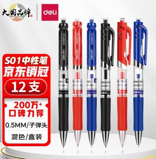 得力(deli)中性笔 0.5mm子弹头经典办公签字笔 水笔按动笔 9黑2红1蓝 33513