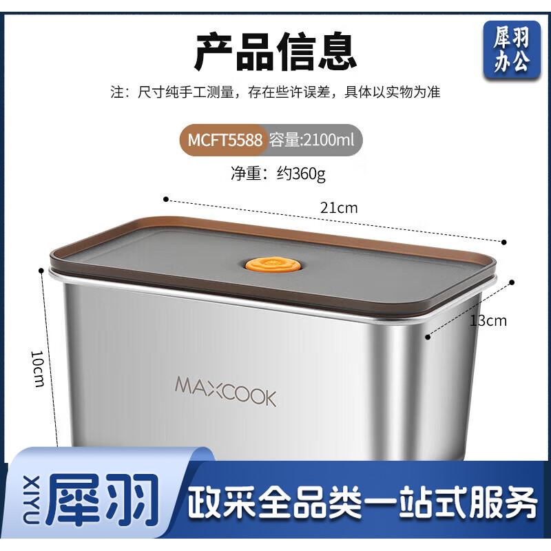 美厨(maxcook)304不锈钢保鲜盒 带盖饭盒便当盒冰箱密封储物盒2100ml MCFT5588