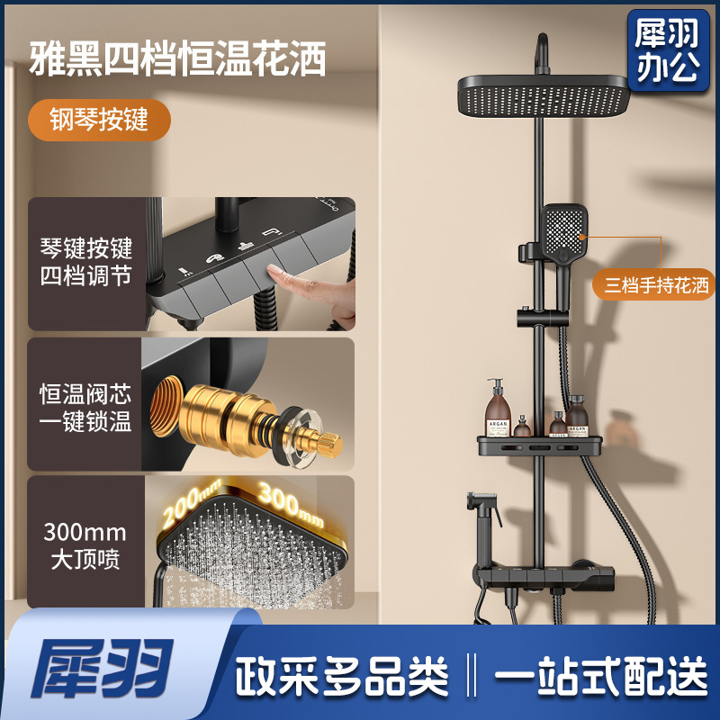学校淋浴花洒套装淋浴器卫生间精铜枪灰恒温洗澡淋雨浴霸增压花洒(钢琴数显按键【雅黑色】四档冷热出水●送架)