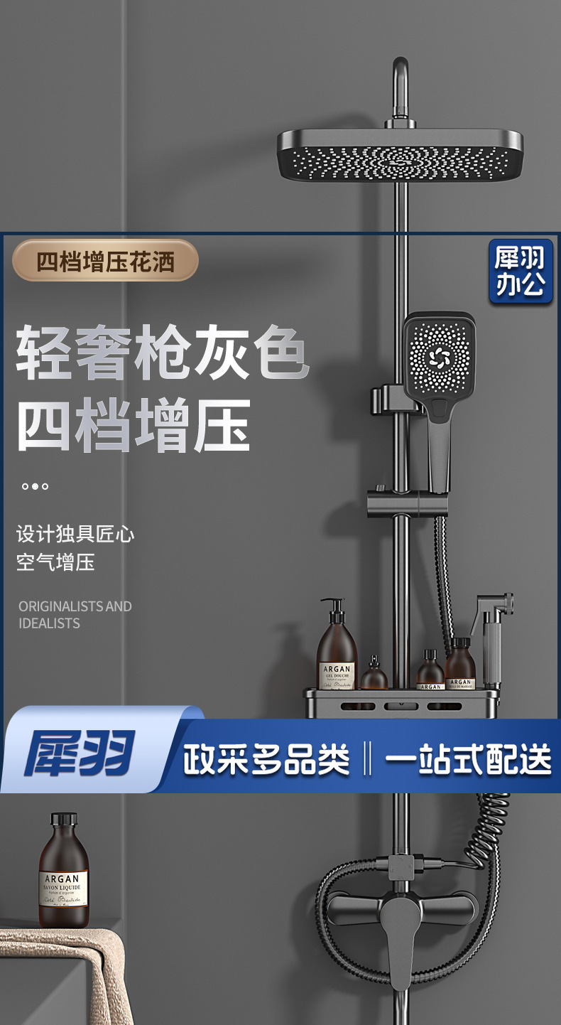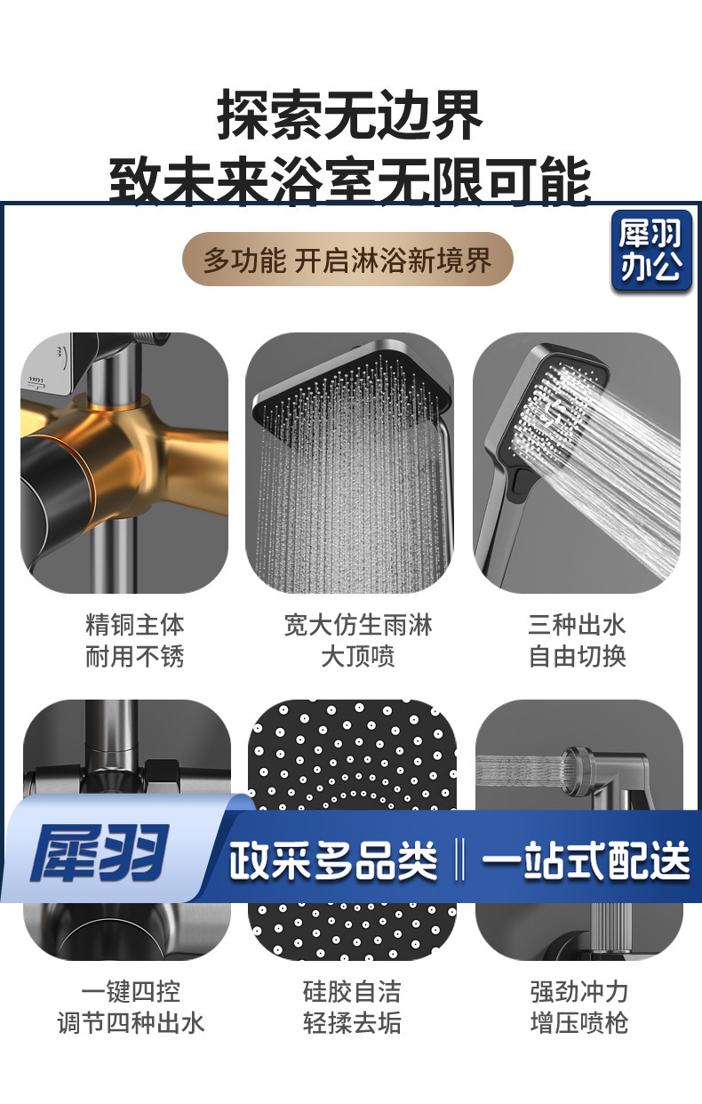 学校淋浴花洒套装淋浴器卫生间精铜枪灰恒温洗澡淋雨浴霸增压花洒(钢琴按键【雅黑色】四档恒温出水●送置物架)