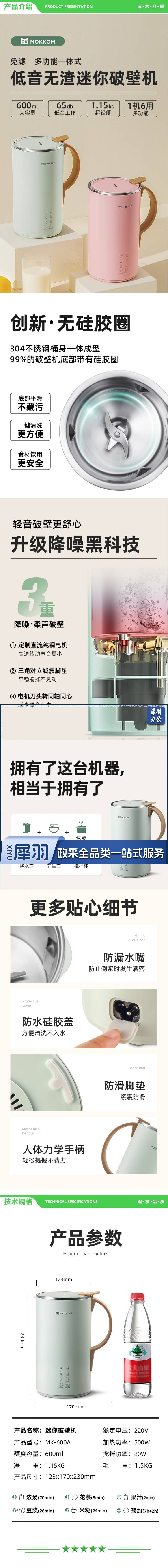 磨客 mokkom MK-600A 破壁机迷你豆浆机小型免过滤免煮预约多功能家用自动辅食机1-3人榨汁搅拌一机六用 绿色