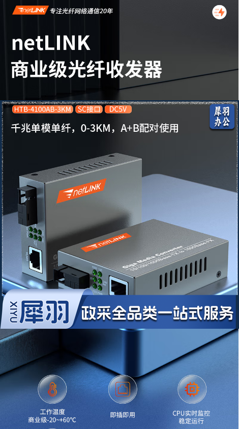 netLINK HTB-4100AB-3KM 光纤收发器 千兆单模单纤光电转换器 0-3公里 DC5V 一对JDXC02080720176158