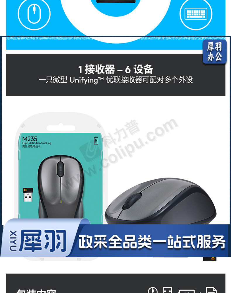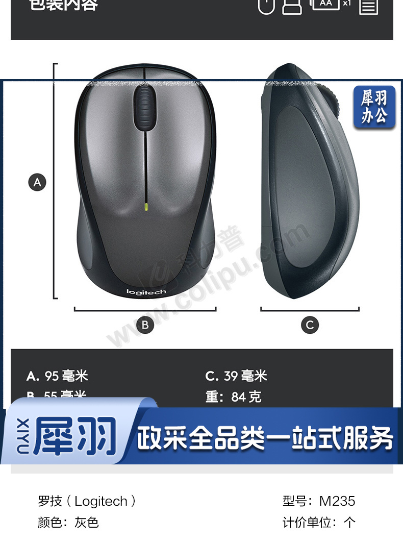 罗技 Logitech 无线鼠标 M235 带2.4G接收器-USB (灰色)