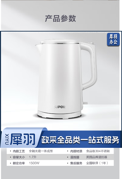 苏泊尔(SUPOR)电水壶 双层防烫烧水壶热水壶 全钢无缝内胆电热水壶SW-17J418 1.7L大容量