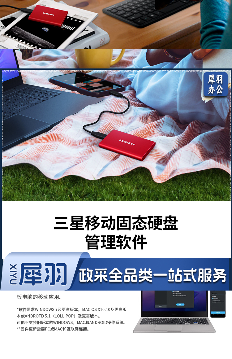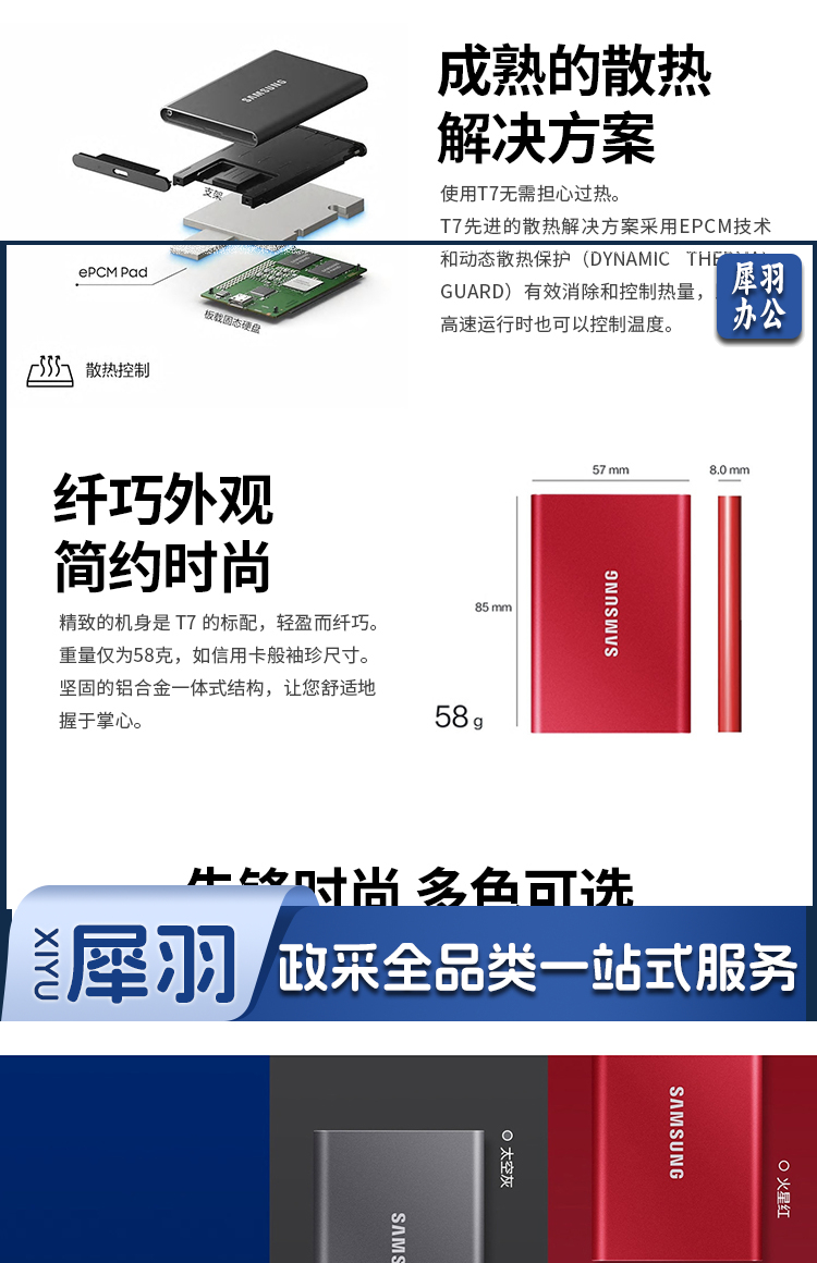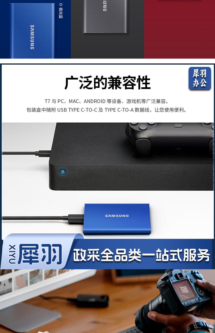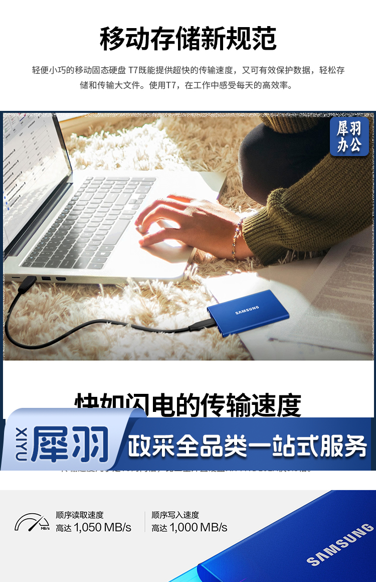 三星(SAMSUNG) 1TB Type-c移动硬盘 固态PSSD T7 超极速NVMe高速传输1050MB/秒 太空灰MU-PC1T0T