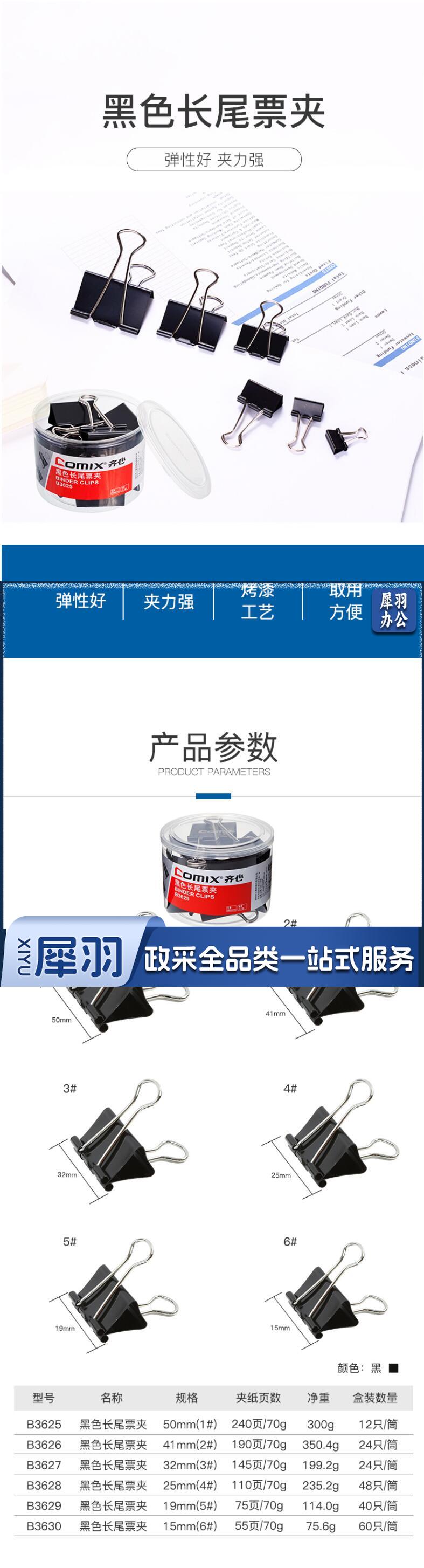 齐心(Comix)长尾夹票夹 黑色金属 5#19mm 40只/筒B3629