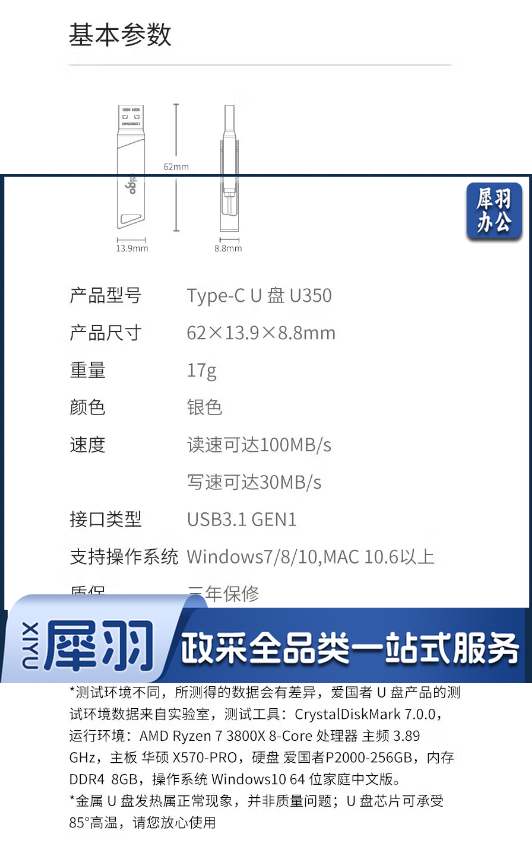 爱国者U350 128GB Type-C USB3.0 手机U盘 银色