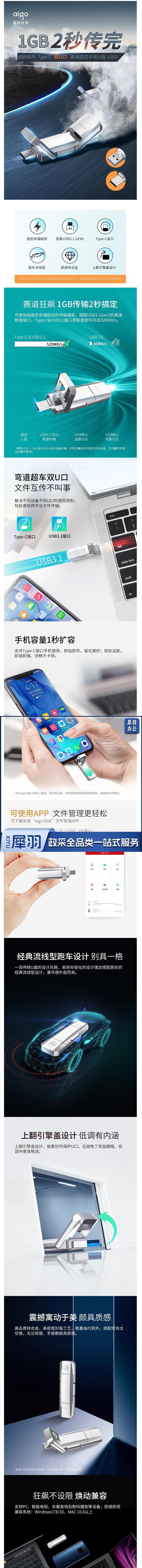爱国者 128G极速USB3.1 U盘 Type-C双接口高速ssd U393 读520MB