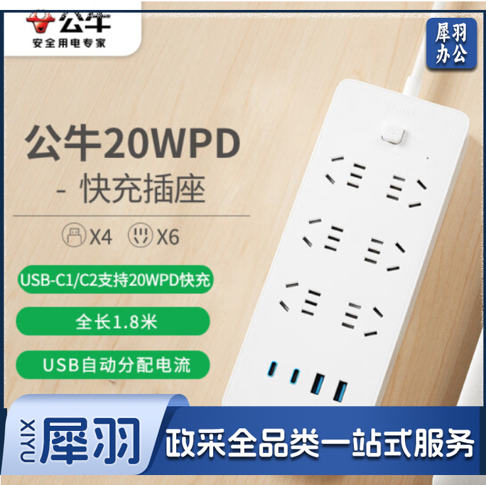 公牛(BULL)20W PD苹果快充插座/插线板/插排/接线板 Type-c口+USB口+6插孔 全长1.8米白色 GNV-U1206
