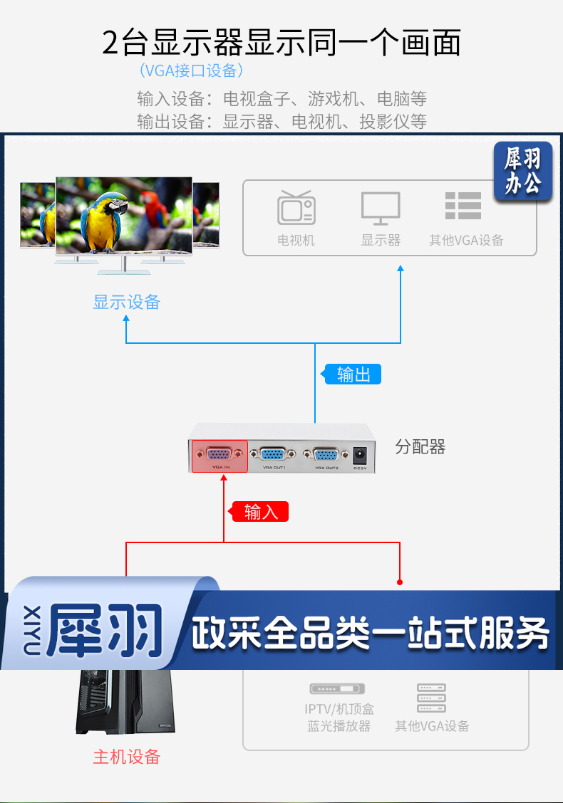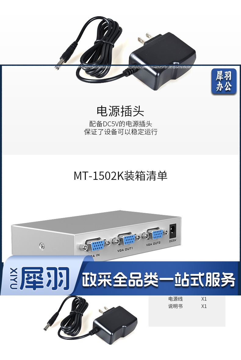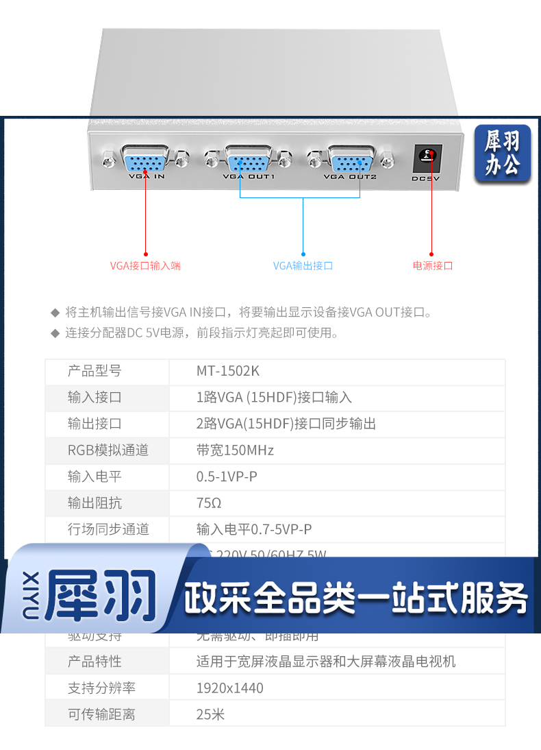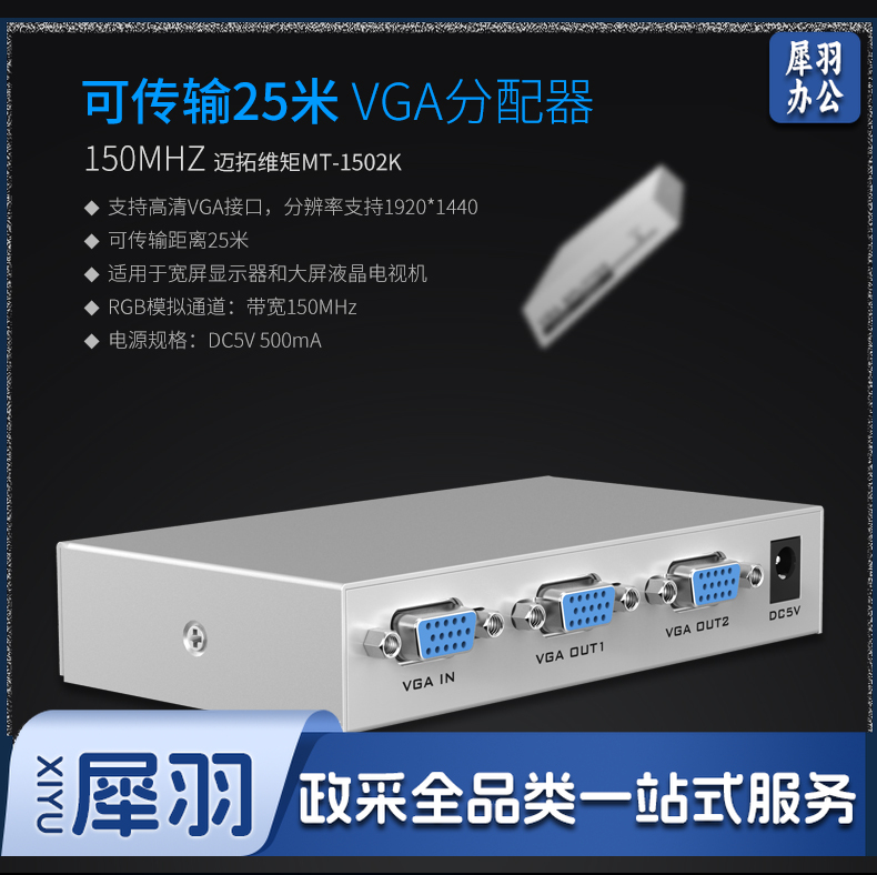 迈拓维矩MT-1502K vga分配器一分二分频器一进二出高清vga分屏器1分2